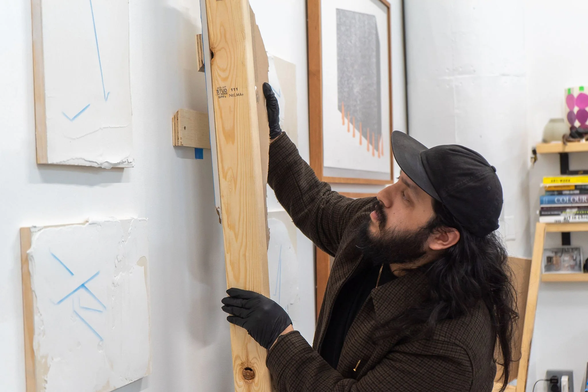 By identifying gestures in his art-making process, such as removing tape after painting a gallery wall or pushing joint compound through drywall, I fossilize the unseen labor of an art preparator. These actions help Mora relate to the unseen labor of undocumented immigrants who support the operations of many industries in the US. He sees art preparators and undocumented immigrants working in the shadows of great institutions, but they are rarely recognized.
